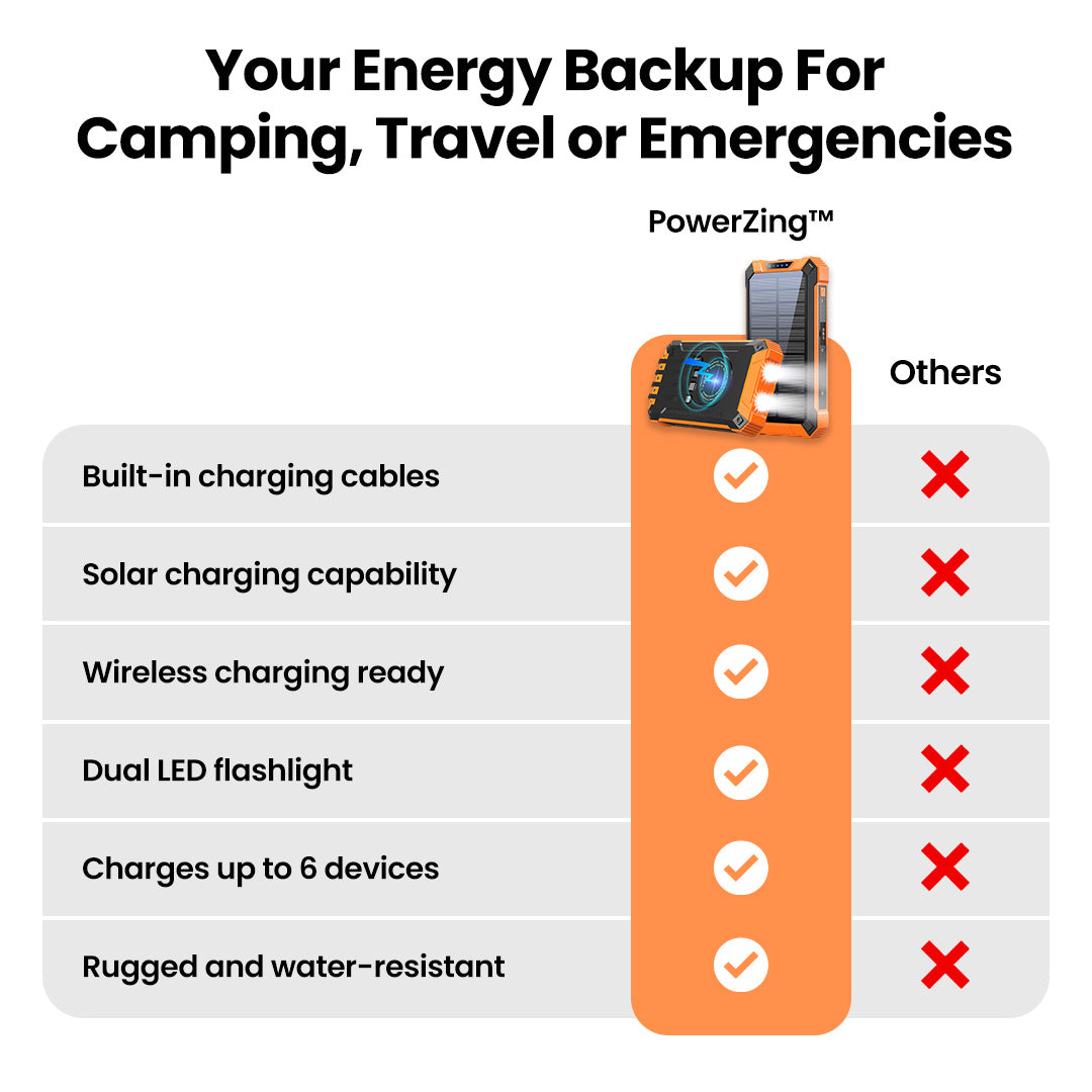 When sudden storms, floods or blackouts strike, The Solar ZingBank is your lifeline. With solar charging and built-in cables, it is peace of mind for any emergency and you'll never have to face the stress of a dead battery again.